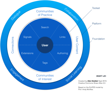 December 9, 2010I am enjoying reading Andy McAffe’s “Enterprise 2.0” book. Here is a bull-eye type chart illustrating the SLATE concept (Search, Links, Authorship, Tags, Extensions, Signals) that summarizes what he calls the “Emergent Social Software Platforms” (ESSPs).