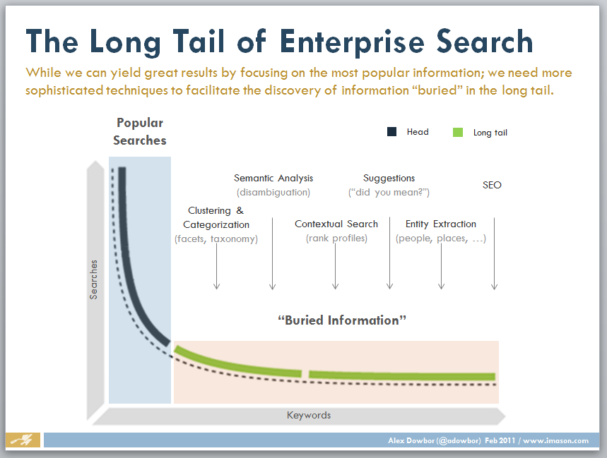Understanding this behaviour is important in order to optimize and tune the search experience, as specific tools and techniques are available to deal with the different sectors of the curve. While the “head” is prone to manual intervention allowing content managers to bias known results to ensure higher relevancy, the “tail” is where more sophisticated search platforms can make a difference by surfacing the otherwise buried information in ways that provide insight to the end-users. A good enterprise search experience will, among other things establish a conversation with the user helping him or her navigate and drill down to the right information.