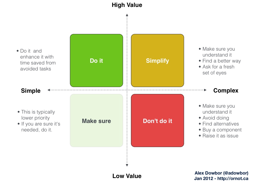Often software development projects go off the rails or deliver a low value end-product. Budgets are not getting any bigger and teams are trying to deliver more efficiently using various techniques. One of my favorite technique is to find the things that you don’t have to do before it’s to late (and we have already lost time and money doing it). This is based on the premise that most if not all software development projects include a number of things that do not need be done at all, and many that can be simplified or adjusted and still deliver the same business value. I have yet to find a project where there were no features, sub-features or technical tasks that could be avoided. One of the reasons this happens has to do with how most software requirements are defined: they are defined without much critical dialogue between business and technology. Therefore, in many cases we end-up missing on the opportunity to shape a product that is technically simpler with high business value. Developers that at some point receive the “spec” feel far removed or simply don’t bother to question a requirement that is complex to implement and just go ahead and develop complicated solutions that are not necessarily required by the business or could be easily adapted to suppress or significantly reduce complexity. Multiply this again and again during a project and you have a lot of missed budget saving and complexity management opportunities.